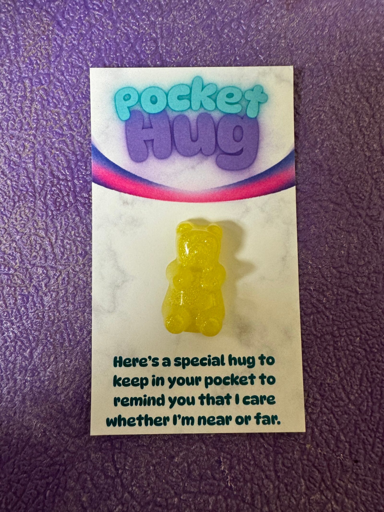 Choose between a resin bear or a heart as the centerpiece of your Pocket Hug gift. While the type of hug is yours to decide, the specific color and design add an element of surprise, making each piece truly unique. This thoughtful touch ensures that every recipient feels special, whether it’s a friend, parent, sibling, or partner. The blend of personalization with an unpredictable twist adds excitement and charm to the gesture.