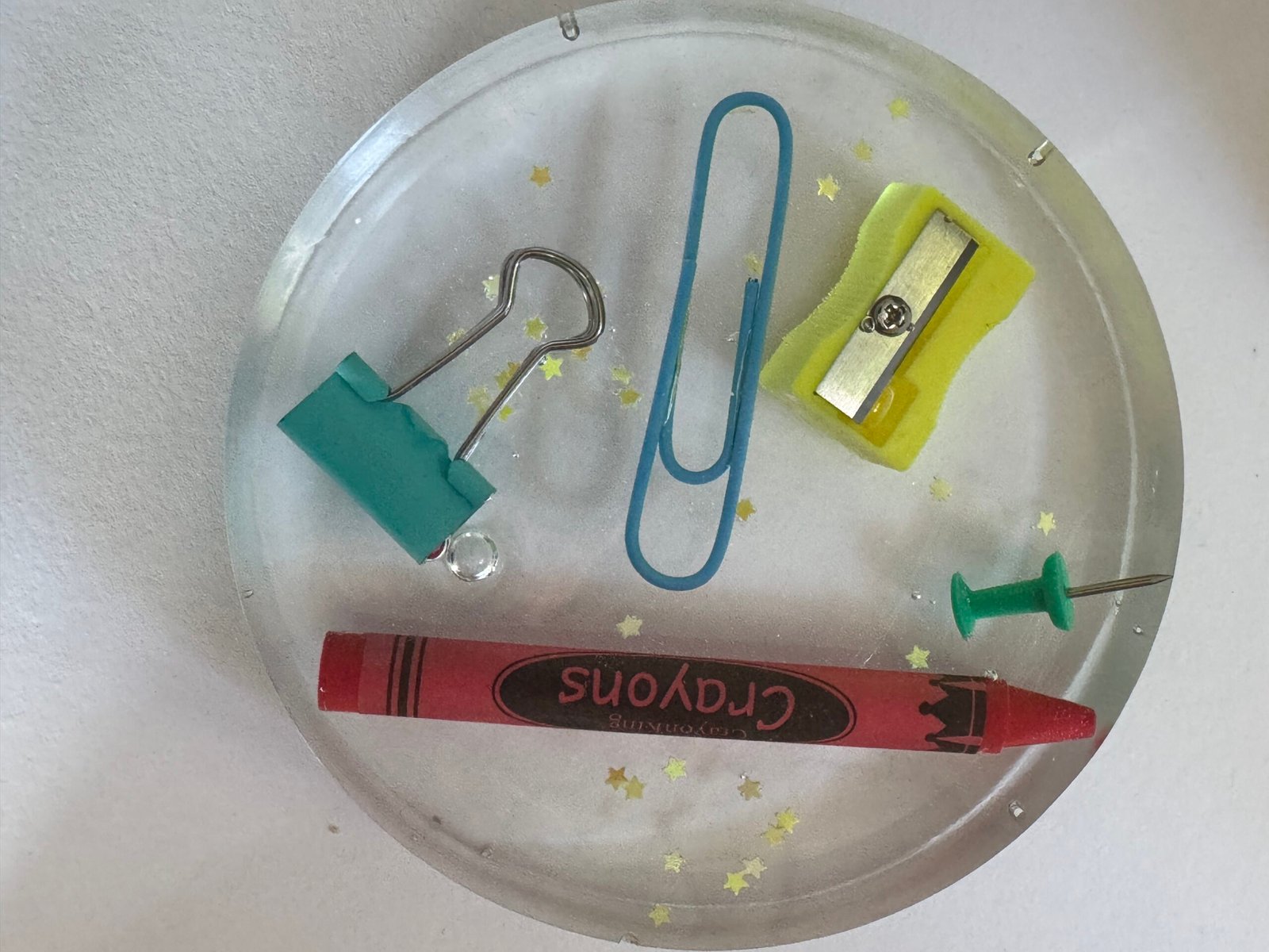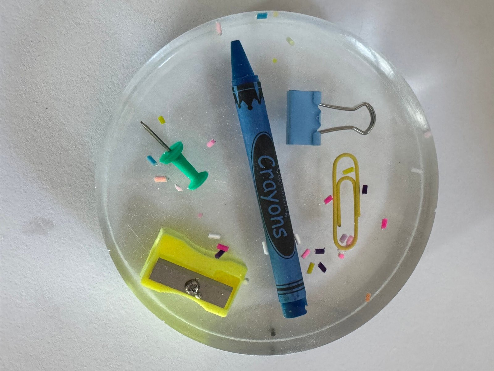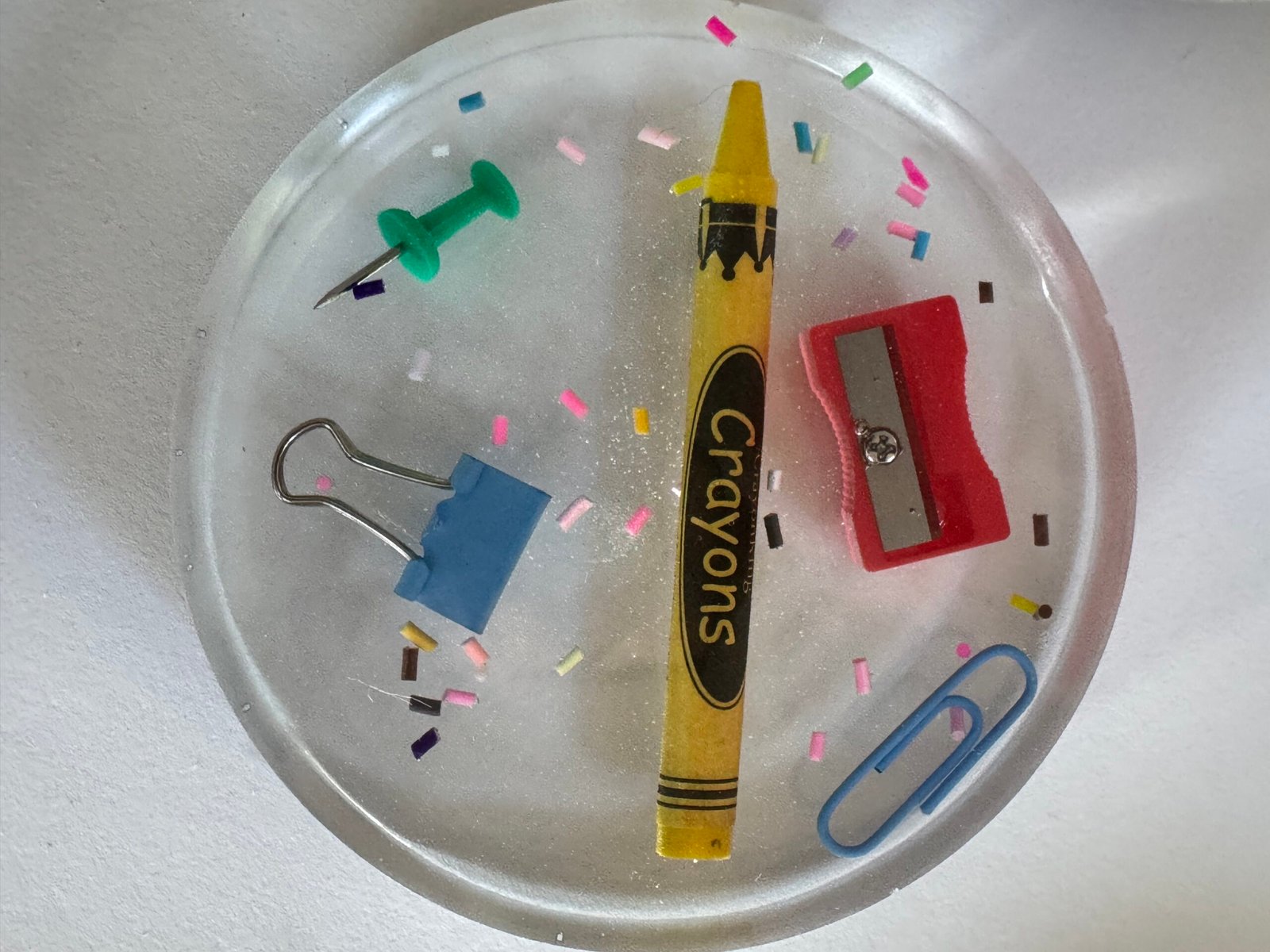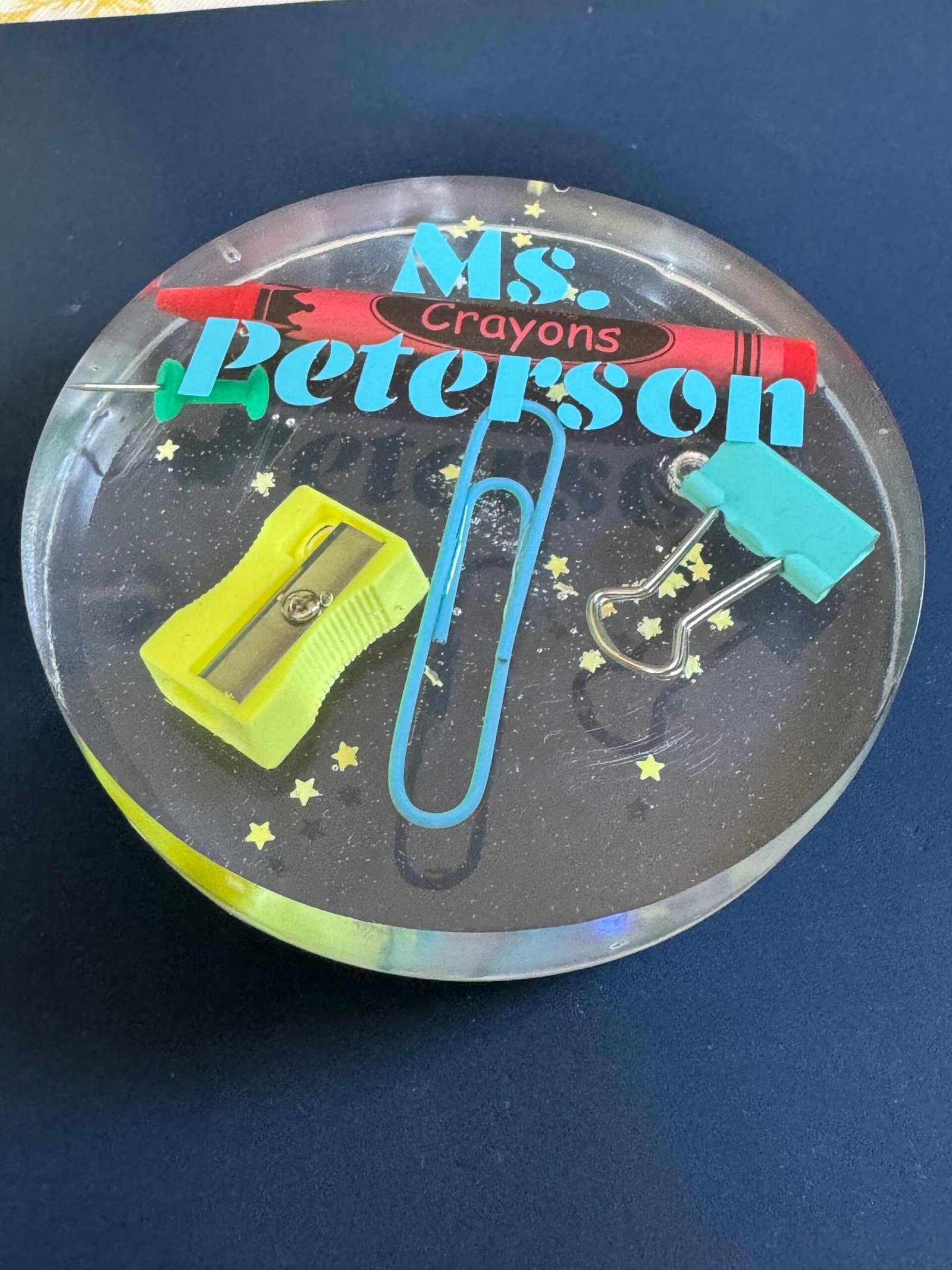 Looking for the perfect gift to show appreciation for a dedicated teacher? Our personalized resin paperweight is a thoughtful and unique choice. Each paperweight beautifully encapsulates a variety of school supplies, such as a pencil sharpener, crayon, paperclip, binder clip, rubber band, and more — making it both functional and decorative. Every piece is one-of-a-kind, just like the amazing teachers who inspire us daily.