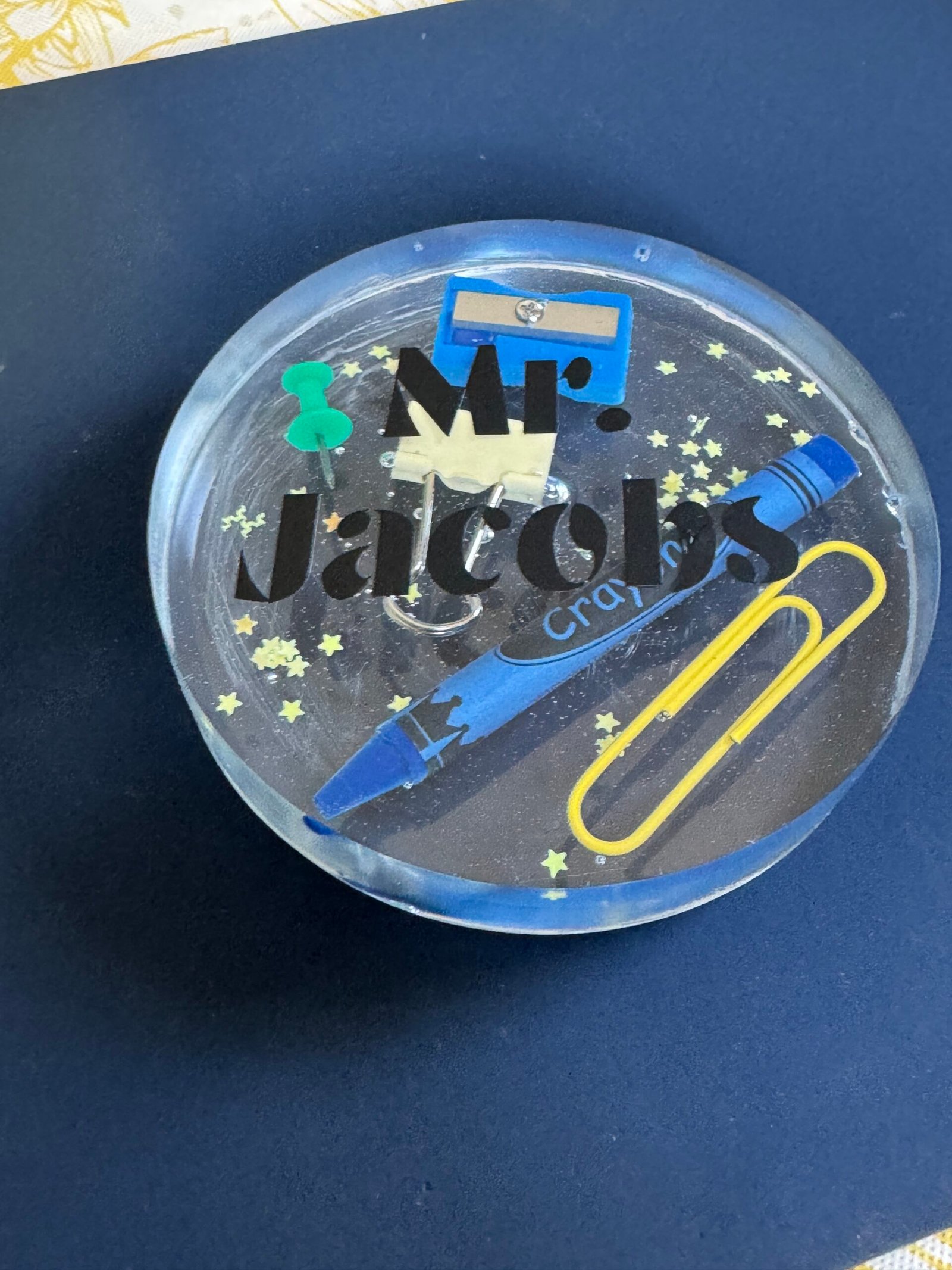 Make your resin paperweight even more special by adding the teacher’s name as personalization. This option allows you to choose from a selection of vinyl colors, giving a personal touch to your gift. During checkout, simply include the name and preferred vinyl color in the order notes section. While requested school supplies or color preferences are welcome, please note that they cannot be guaranteed due to the nature of handmade craftsmanship.
